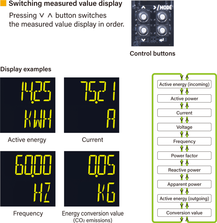 The OEL display allows you to check the measured values of voltage, current, power, energy, CO2 emissions (energy conversion value), and relative harmonic content of each element, as well as various setting values.