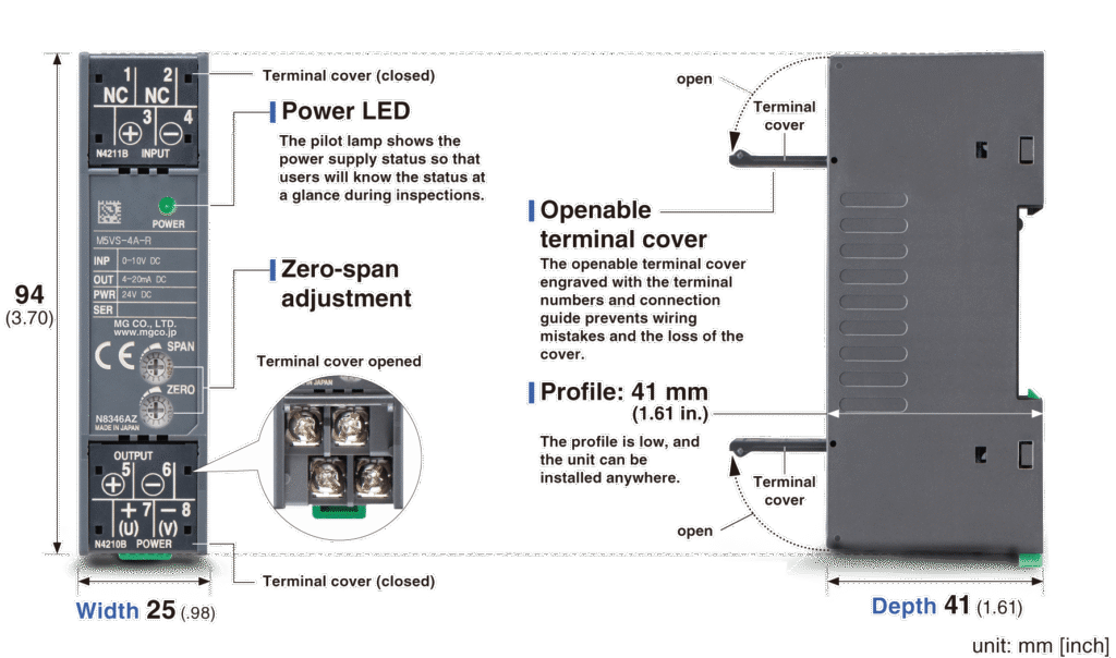 The M5MV is a signal transmitter incorporating an electric circuit based on the electric circuit design of the M5VS so that the input section can handle minute signals. Also, as with the M5VS, the AC power supply does not use aluminum electrolytic capacitors.